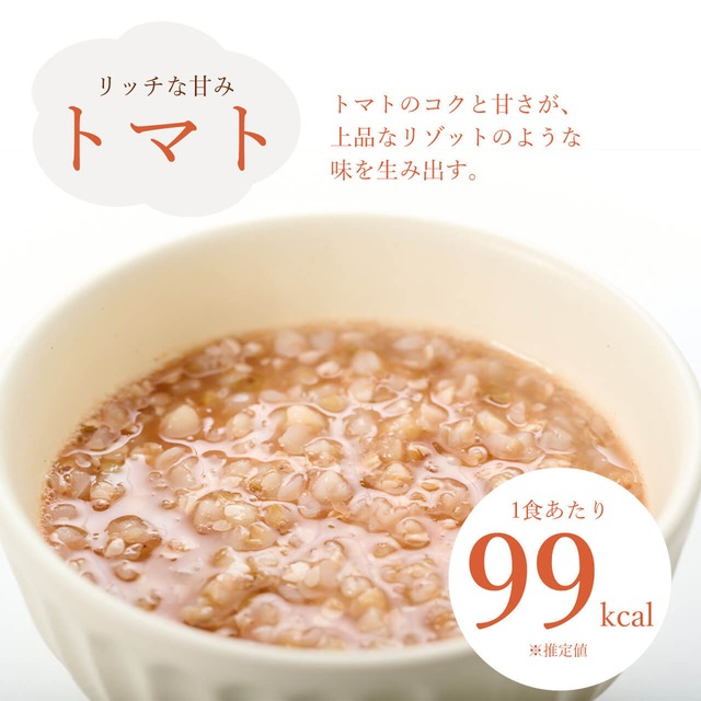 必須アミノ酸の含有率が高いたんぱく質が豊富に含まれており、ビタミンB群、ルチン(ビタミンP)、食物繊維などの栄養素も豊富な「スーパーフード」そばの実が主役のグルテンフリー、プラントベースフードです。 【毎⽇が忙しく、気にはなるけどついついコンビニのお弁当ですましてしまう方】 【最近、便秘気味のせいか肌荒れやイライラが気になっている方】 【野菜中⼼の⾷⽣活で、⼼も⾝体も整えてみたいと感じている方】 【気軽にダイエットをしたい方】 におすすめです。 三重県の特産品が主役の味付けで、飽きがこないおかゆになりました。 【トマトについて】 三重県津市の太陽光利用型植物工場で最先端の管理システムとスタッフの方の丁寧な手入れによって生産させるブランドミニトマト「あづまこべに」を使用しました。出荷の中で出てくる少し大きかったり傷がついたミニトマトの活用として生まれたあづまこべにのピューレは、そばの実のおかゆにコクと甘さを加え、上品なリゾットのような味わいになりました。 【お召し上がり方】 温めずにそのままでもお召し上がりいただけますが、温める際は必ずお皿に移してラップをかけ、500Wで60秒を目安に加熱ください。