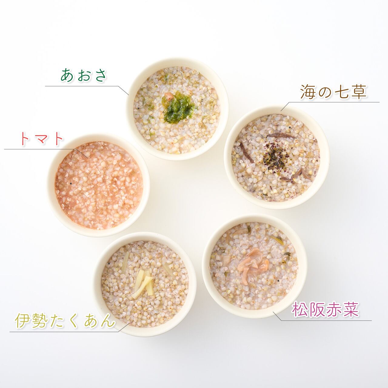 地元産のそばの実と塩麹を使用したそれぞれのおかゆには、